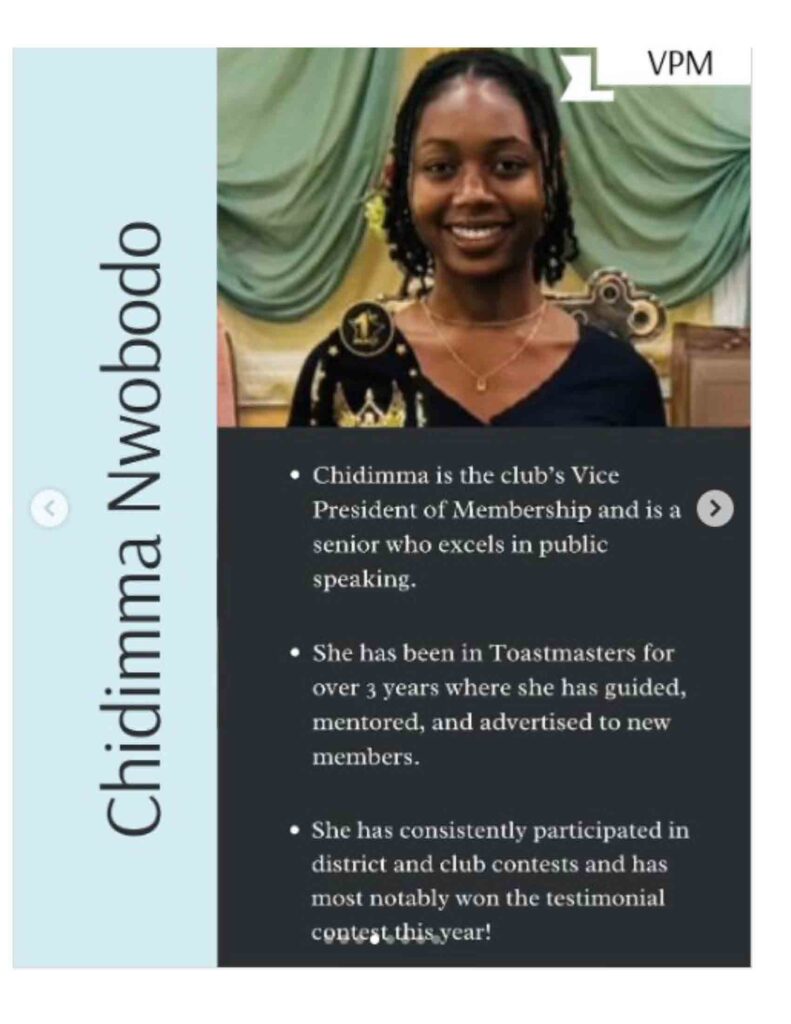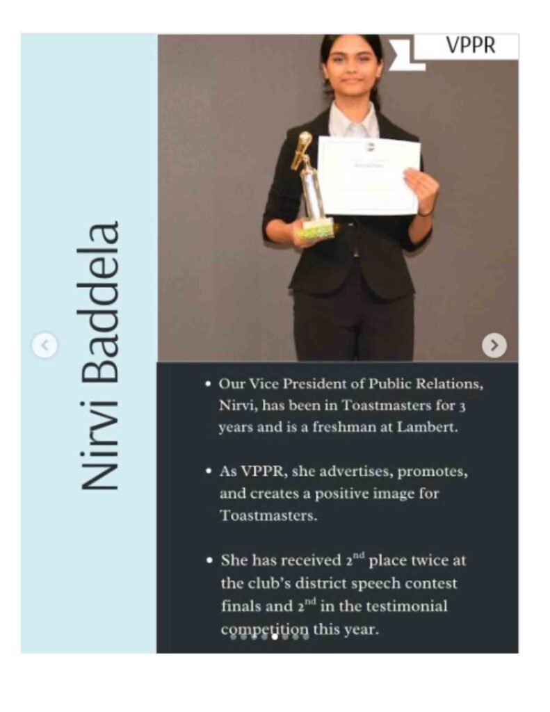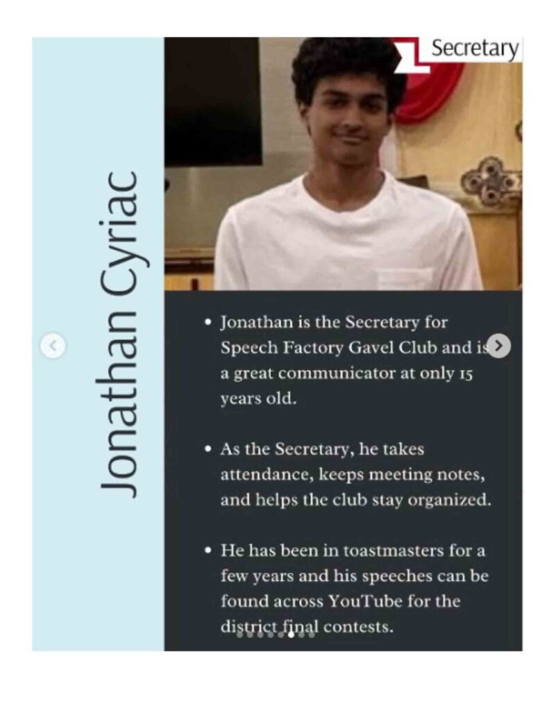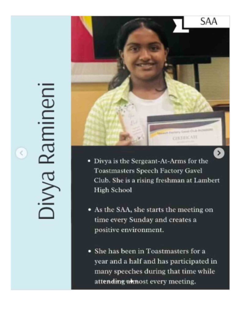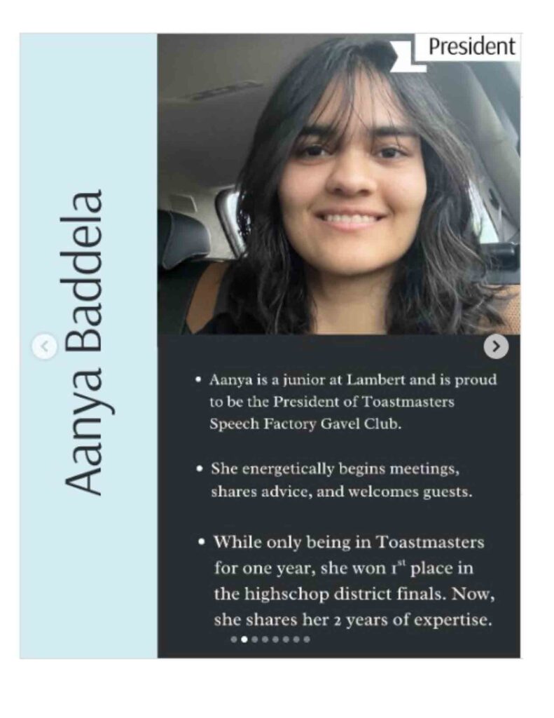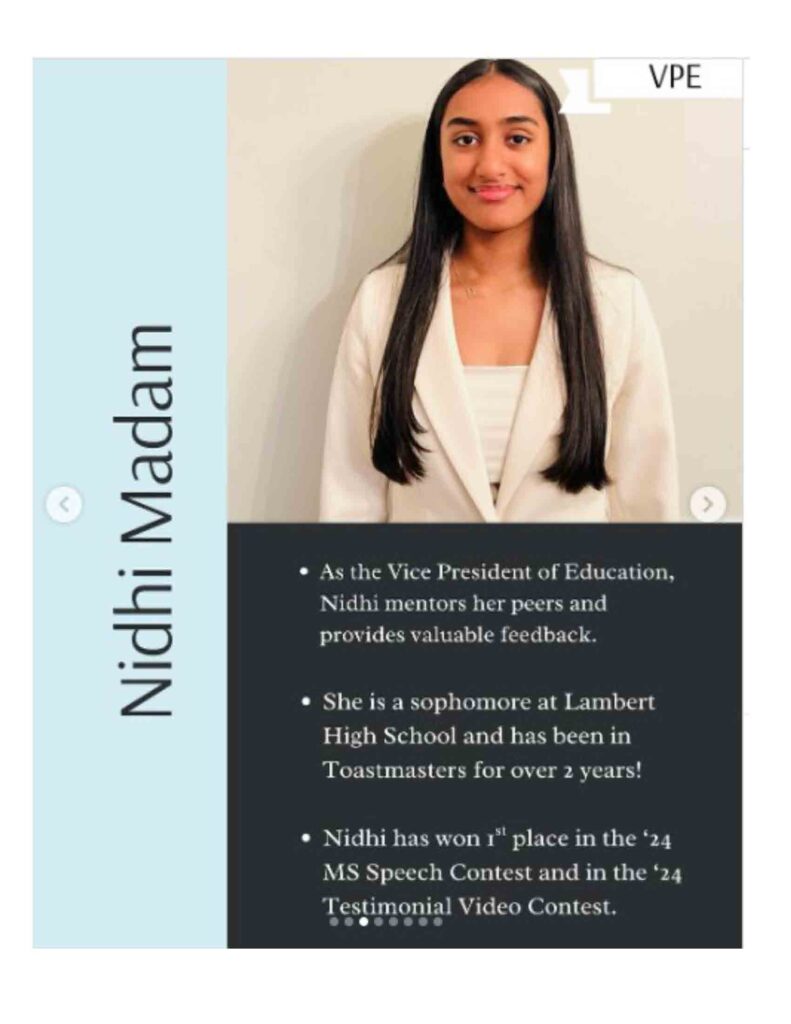 Club President-Aanya Baddela CC VP Education-Nidhi Madam, CL VP Membership-Chidimma Nwobodo, CC VP Public Relations-Nirvi Baddela, CC Secretary-Jonathan Cyriac, CC Sergeant-at-arms-Divya Ramineni